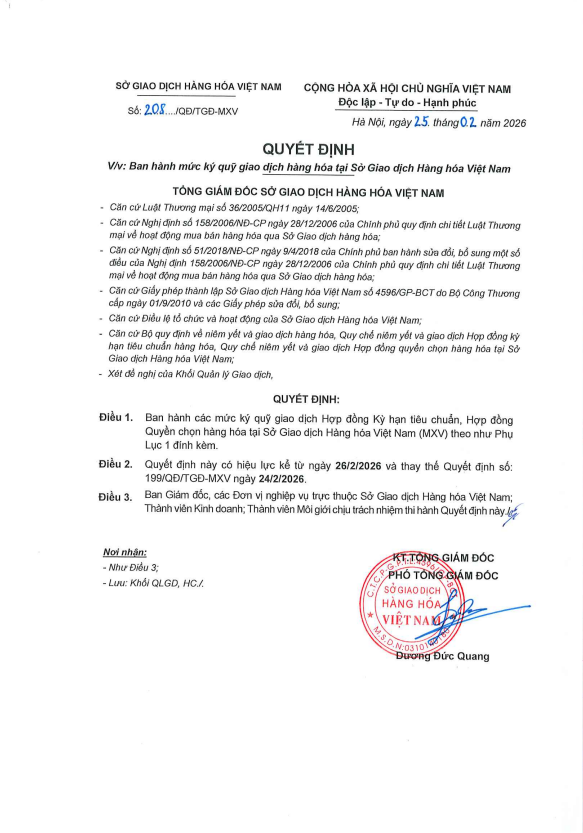 CDT Investment xin gửi tới về Quý Khách hàng Quyết định số 208/QĐ/TGĐ-MXV ngày 25/02/2026 về việc Ban hành mức ký quỹ giao dịch hàng hóa, áp dụng từ phiên giao dịch ngày 26/02/2026.