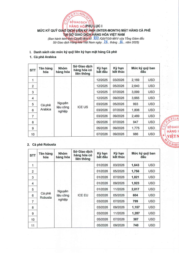 CDT Investment xin gửi tới về Quý Khách hàng Quyết định số 836,837/QĐ/TGĐ-MXV ngày 26/11/2025 về việc Ban hành mức ký quỹ giao dịch hàng hóa và giao dịch liên kỳ hạn mặt hàng Cà phê tại Sở Giao dịch Hàng hóa Việt Nam, áp dụng từ phiên giao dịch ngày 27/11/2025.