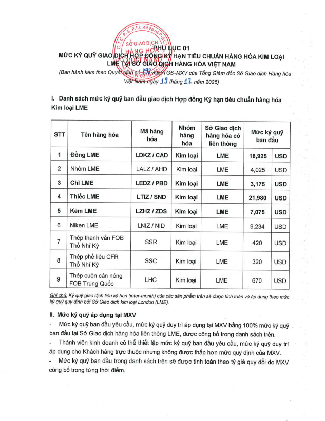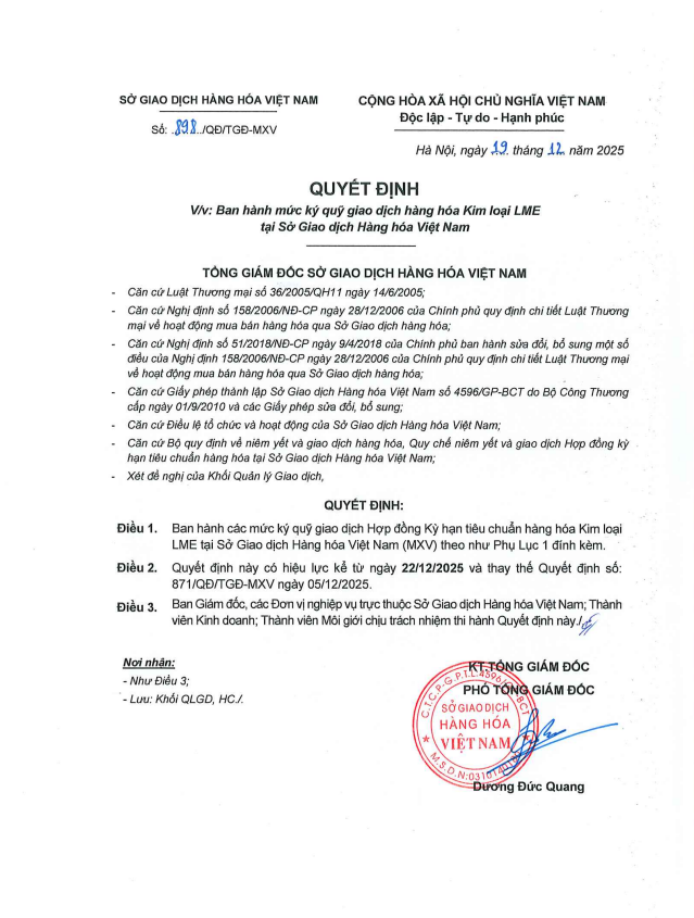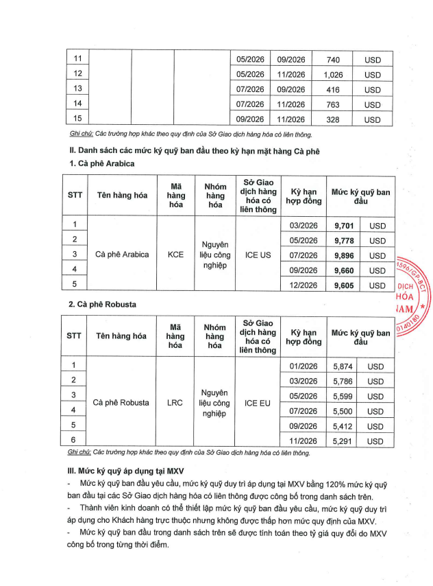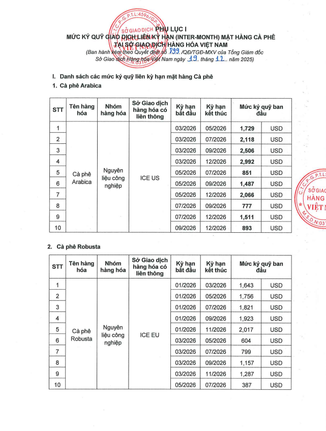 CDT Investment xin gửi tới về Quý Khách hàng Quyết định số 898,899/QĐ/TGĐ-MXV ngày 26/11/2025 về việc Ban hành mức ký quỹ khi giao dịch liên kỳ hạn mặt hàng Cà phê và giao dịch hàng hóa Kim loại LME.