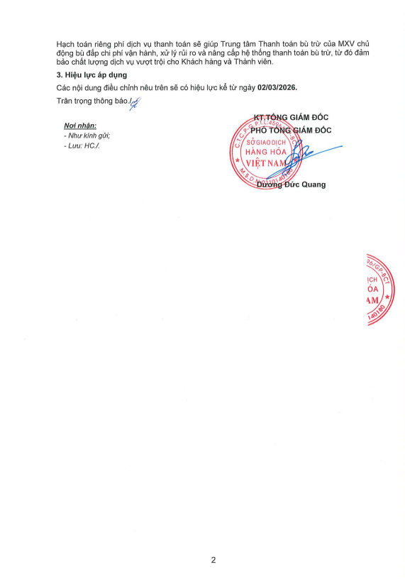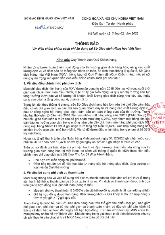 CDT Investment xin gửi tới Quý khách hàng Thông báo số 185/TB/GD-MXV ngày 12/02/2026 về việc: Điều chỉnh chính sách phí áp dụng tại Sở Giao dịch Hàng hóa Việt Nam.