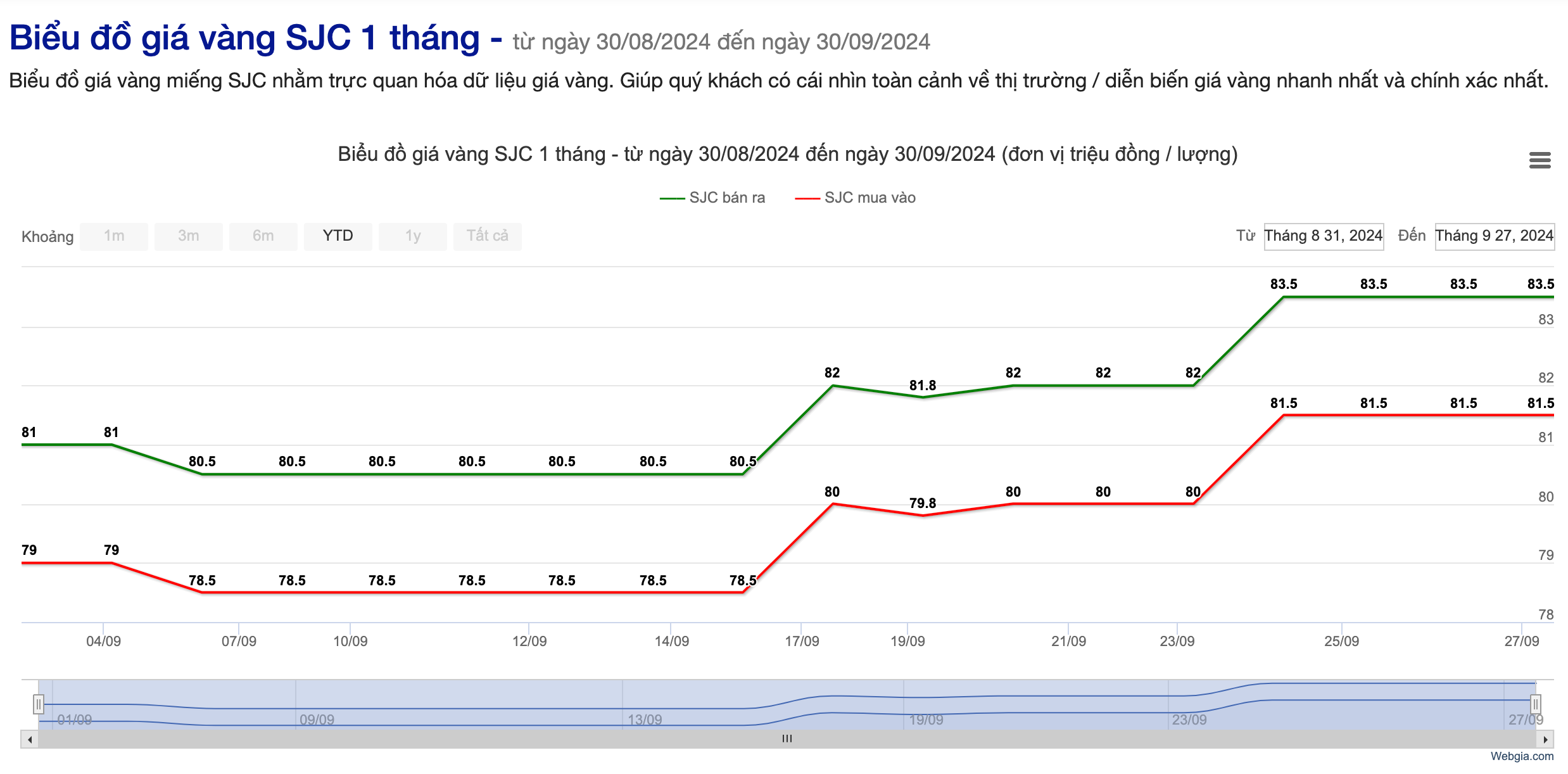 Chênh lệch giá mua - bán vàng SJC 1 tháng