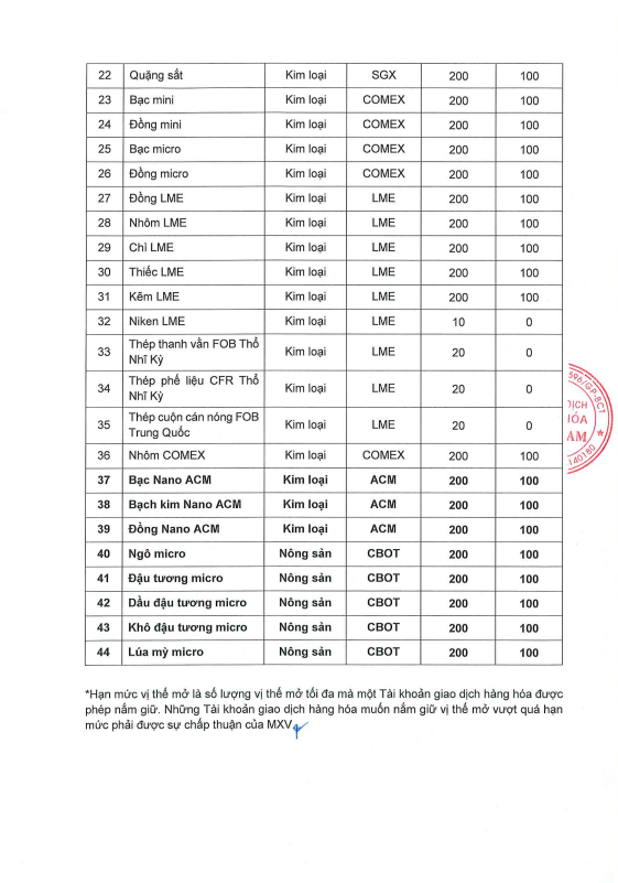 Thông báo Ban hành hạn mức vị thế mở của Tài khoản giao dịch hàng hóa đối với từng mặt hàng niêm yết giao dịch tại MXV