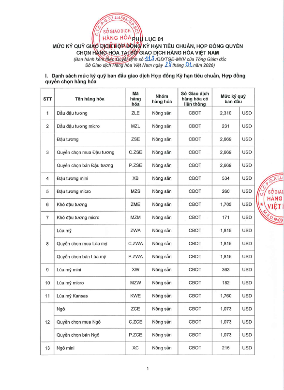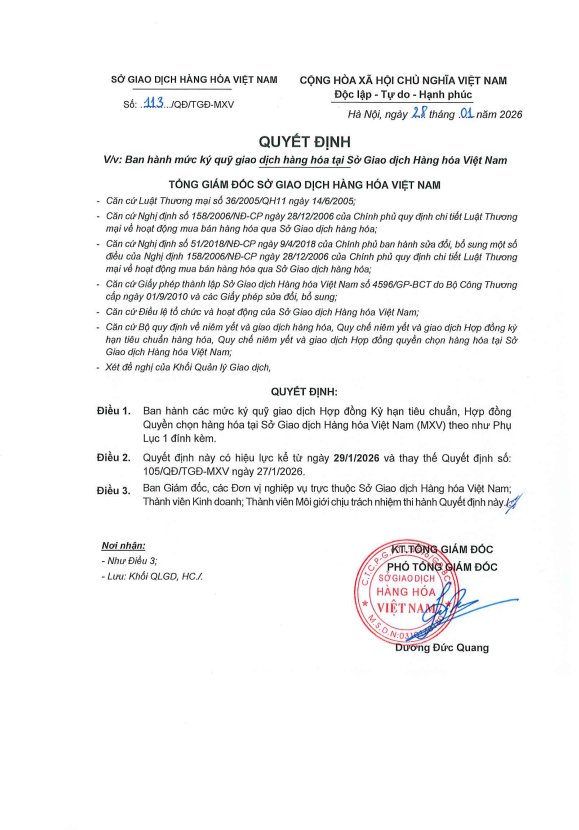 CDT Investment xin gửi tới về Quý Khách hàng Quyết định số 113,114/QĐ/TGĐ-MXV ngày 28/01/2026 về việc Ban hành mức ký quỹ giao dịch hàng hóa, giao dịch liên kỳ hạn mặt hàng Cà phê tại MXV áp dụng từ phiên giao dịch ngày 29/01/2026.