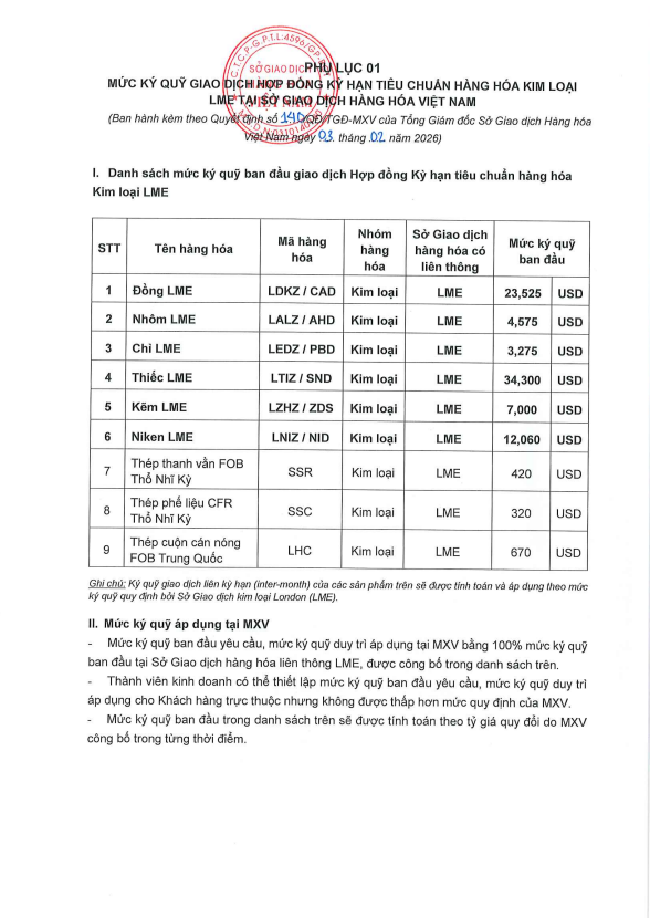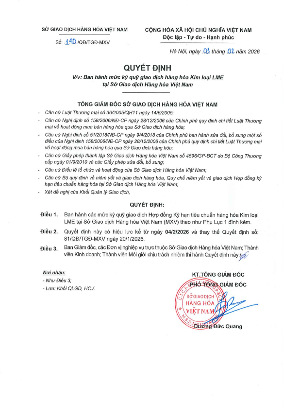 CDT Investment xin gửi tới về Quý Khách hàng Quyết định số 140/QĐ/TGĐ-MXV ngày 03/02/2026 về việc Ban hành mức ký quỹ giao dịch hàng hóa Kim loại LME tại Sở Giao dịch Hàng hóa Việt Nam, áp dụng từ phiên giao dịch ngày 04/2/2026.