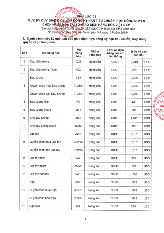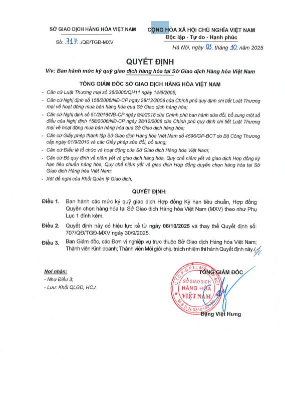 CDT Investiment xin gửi đến Quý Khách hàng Quyết định số 717/QĐ/TGĐ-MXV ngày 03/10/2025 về việc Ban hành mức ký quỹ giao dịch hàng hóa áp dụng từ phiên giao dịch ngày 06/10/2025.