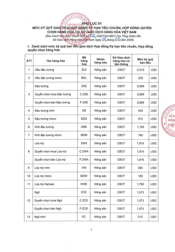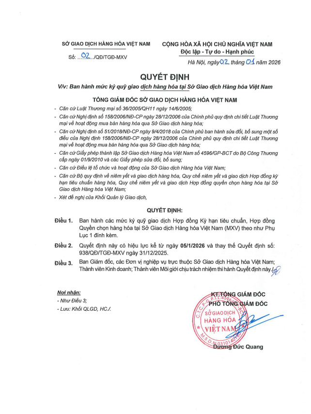 CDT Investment xin gửi tới về Quý Khách hàng Quyết định số 02/QĐ/TGĐ-MXV ngày 02/01/2026 về việc Ban hành mức ký quỹ giao dịch hàng hóa, áp dụng từ phiên giao dịch ngày 05/01/2026.