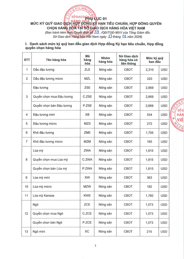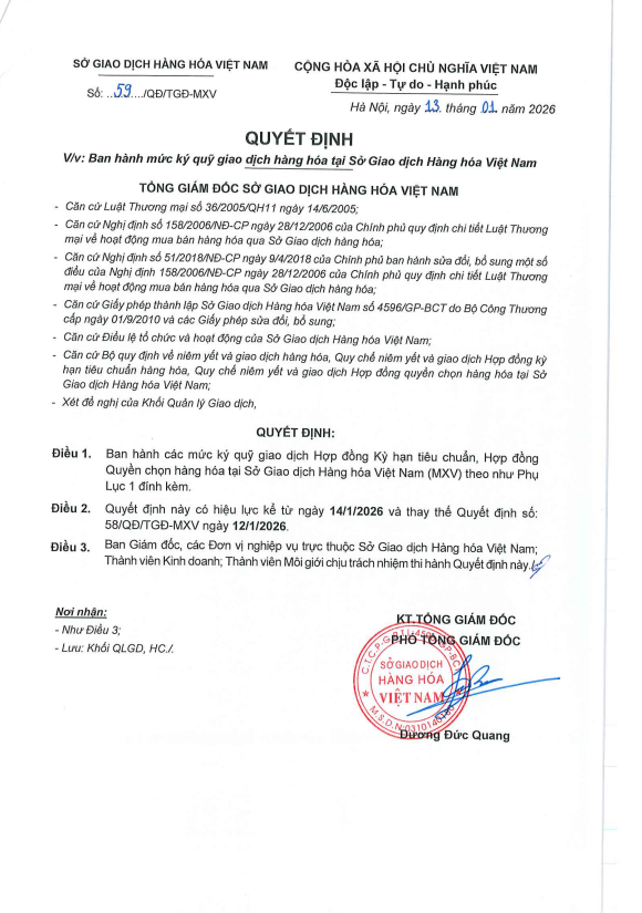 CDT Investment xin gửi tới về Quý Khách hàng Quyết định số 59/QĐ/TGĐ-MXV ngày 13/01/2026 về việc Ban hành mức ký quỹ giao dịch hàng hóa, áp dụng từ phiên giao dịch ngày 14/01/2026.
