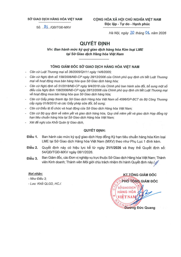 CDT Investment xin gửi tới về Quý Khách hàng Quyết định số 81/QĐ/TGĐ-MXV ngày 20/01/2026 về việc Ban hành mức ký quỹ giao dịch hàng hóa, áp dụng từ phiên giao dịch ngày 20/01/2026.