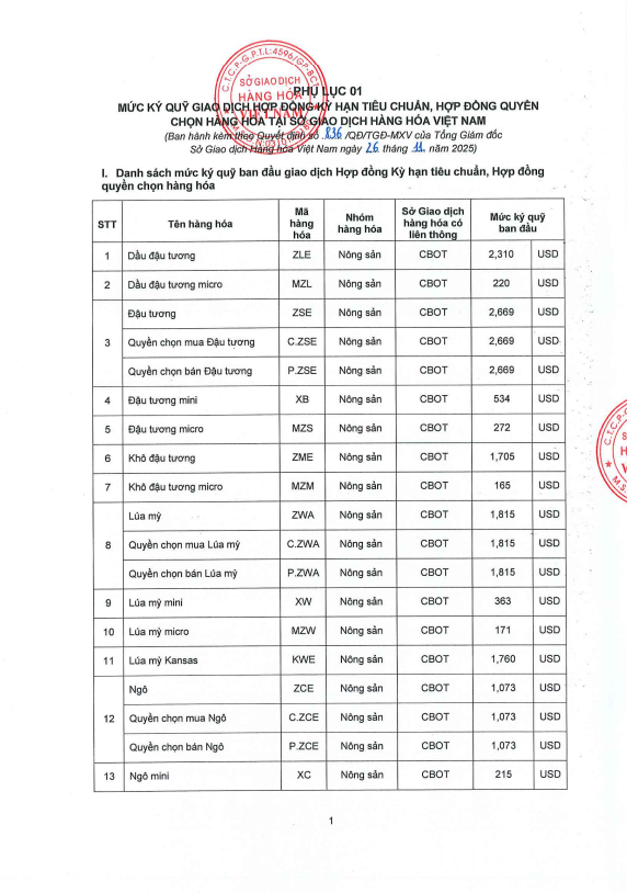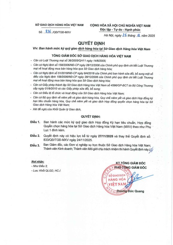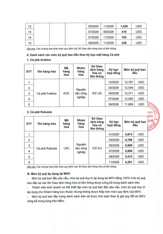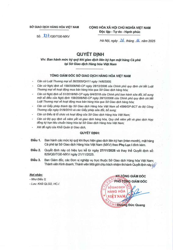 CDT Investment xin gửi tới về Quý Khách hàng Quyết định số 836,837/QĐ/TGĐ-MXV ngày 26/11/2025 về việc Ban hành mức ký quỹ giao dịch hàng hóa và giao dịch liên kỳ hạn mặt hàng Cà phê tại Sở Giao dịch Hàng hóa Việt Nam, áp dụng từ phiên giao dịch ngày 27/11/2025.