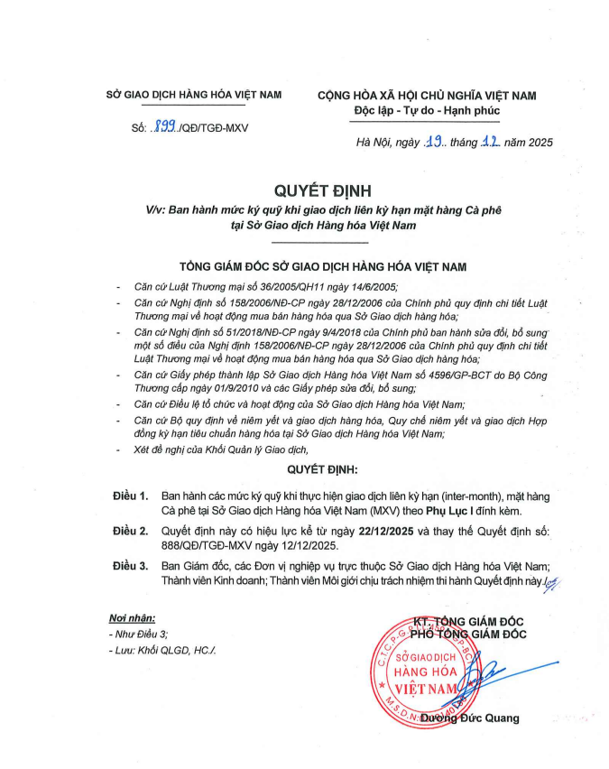 CDT Investment xin gửi tới về Quý Khách hàng Quyết định số 898,899/QĐ/TGĐ-MXV ngày 26/11/2025 về việc Ban hành mức ký quỹ khi giao dịch liên kỳ hạn mặt hàng Cà phê và giao dịch hàng hóa Kim loại LME.
