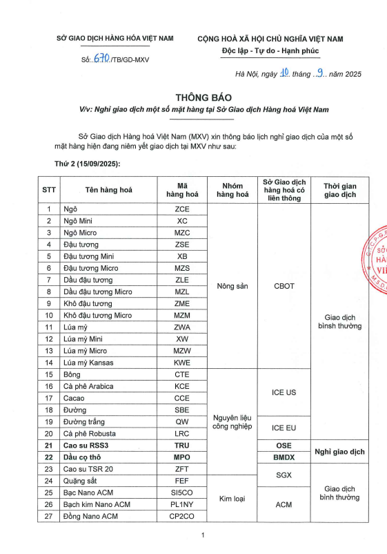 CDT Investment xin gửi tới Quý khách hàng về Thông báo số 670/TB/GD-MXV ngày 10/9/2025 về việc Nghỉ giao dịch một số mặt hàng tại MXV. Sau thời gian nghỉ trên, việc giao dịch các mặt hàng tại Sở Giao dịch Hàng hóa Việt Nam (MXV) sẽ trở lại bình thường theo khung giờ đã được MXV công bố.