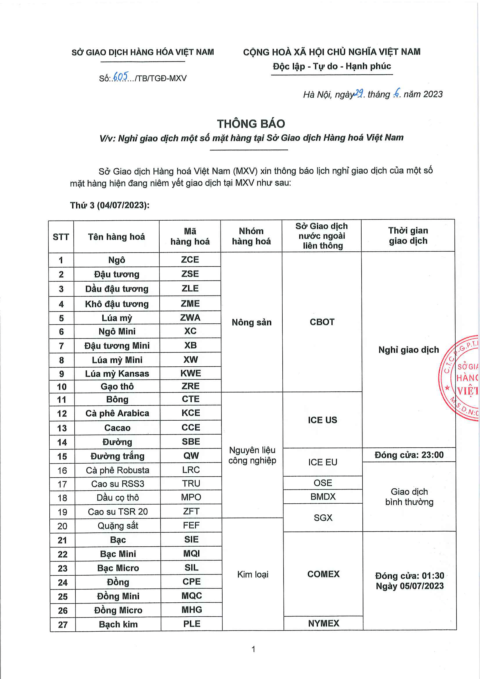 CDT Investment xin gửi tới Quý khách hàng Thông báo của Sở Giao dịch Hàng hóa Việt Nam (MXV) tại ngày 29/06/2023 về việc nghỉ giao dịch một số mặt hàng tại Sở Giao dịch Hàng hóa Việt Nam