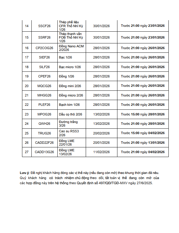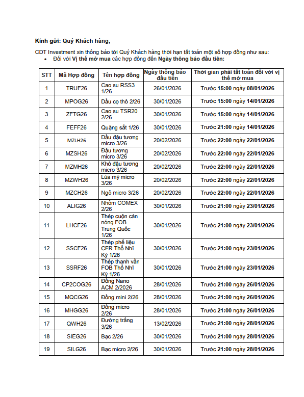 CDT Investment xin gửi tới Quý khách hàng Thông báo thời hạn tất toán các hợp đồng của Sở Giao dịch Hàng hóa Việt Nam (MXV).