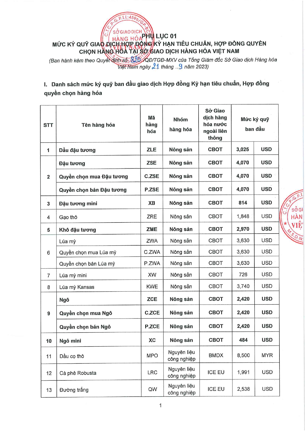 CDT Investment xin gửi tới Quý khách hàng thông báo của Sở Giao dịch Hàng hóa Việt Nam (MXV) về việc Ban hành mức ký quỹ giao dịch hàng hóa và liên kỳ hạn mặt hàng Nông sản tại MXV, áp dụng từ phiên giao dịch ngày 22/9/2023 .
